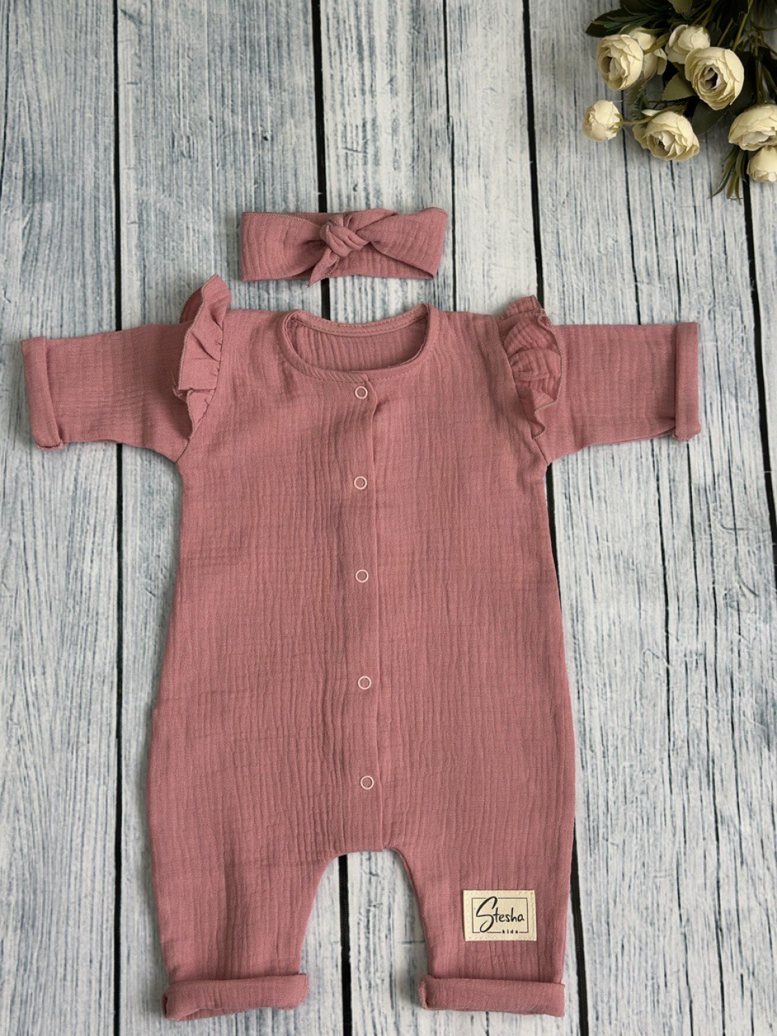 Теги: Купить оптом детский комбинезон . 336-П. Комбинезон с повязкой для девочки из муслина, хлопок 100%, размеры 56,62,68, пудра цена,отзывы официальный сайт "Стеша Феодосия"