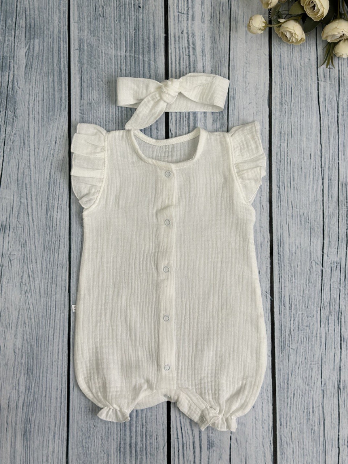 Теги: Купить детские песочники на лето оптом . 341-МО. Песочник с повязкой для девочки из муслина, хлопок 100%, р 62,68,74,80 молочный цена,отзывы официальный сайт "Стеша Феодосия"