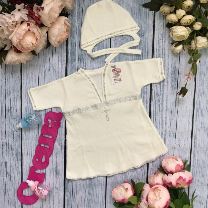 Теги: Купить оптом крестильную рубашку. 169. Крестильная рубашка с чепчиком (серебро), хлопок 100 % интерлок 62,68,74,80 цена,отзывы официальный сайт "Стеша Феодосия"